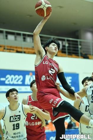 29일 이천에 위치한 LG챔피언스파크에서 열린 2021-2022 KBL D-리그 DB와 상무의 경기, DB 배강률이 골밑으로 파고 들고 있다.