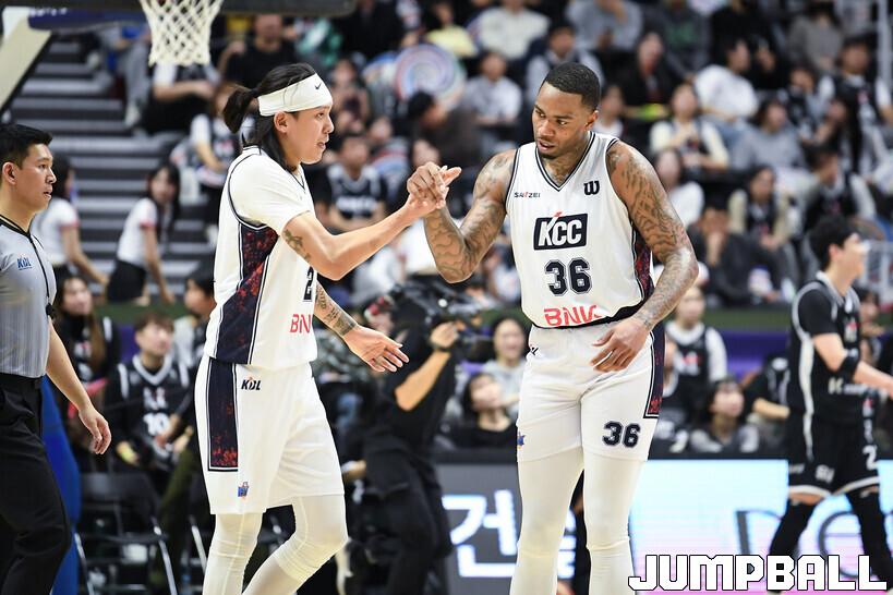 [점프볼=수원/유용우 기자] 8일 수원 KT 소닉붐 아레나에서 열린 2025-2026 LG전자 프로농구 수원 KT와 부산 KCC의 경기, KCC 최준용과 숀 롱이 득점에 성공하고 환호하고 있다.
