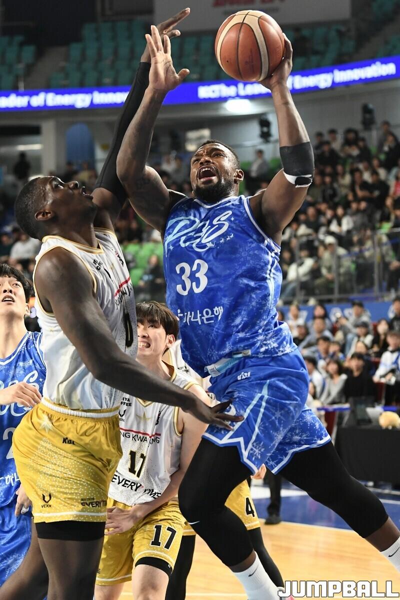 [점프볼=대구/유용우 기자] 20일 대구실내체육관에서 열린 2025-2026 LG전자 프로농구 대구 한국가스공사와 안양 정관장의 경기, 가스공사 닉 퍼킨스가 정관장 오브라이언트의 수비를 두고 공격을 시도하고 있다.
