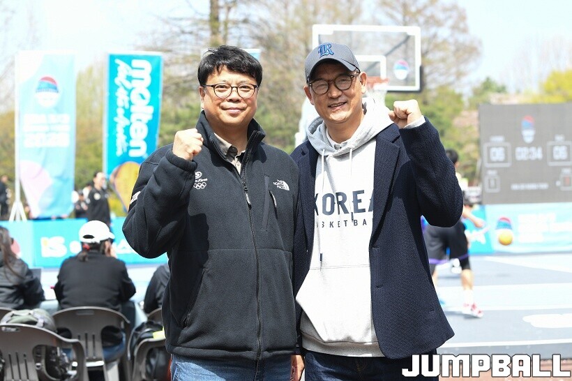 [점프볼=서울/유용우 기자] 11일 서울어린이대공원 열린무대 앞 특설코트에서 KBA 3x3 코리아투어 2026 서울대회 1일차 경기가 열렸다. 초등부, 중등부, 고등부, 오픈부, 여자오픈부 5개 종별 61개팀 234명이 참가하여 이틀에 걸쳐 진행된다. KBA 3x3 코리아투어 2026 서울대회 참가 선수들이 치열한 경쟁을 펼치고 있다. 3x3 남자농구대표팀 배길태 감독과 여자농구대표팀 전병준 감독이 경기장을 찾았다.