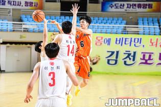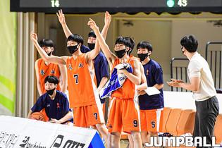 20일 김천실내체육관에서 열린 2021 연맹회장기 전국남녀중고농구 김천대회 남고부 홍대부고와 양정고의 경기, 홍대부고 이건희와 이진성이 하이파이브를 하고 있다.