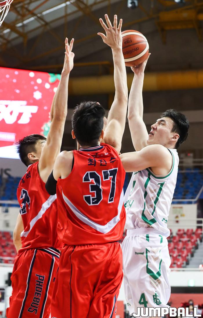 [점프볼=윤민호 기자] 26일 울산 동천체육관에서 열린 2020-2021 현대모비스 프로농구 울산 현대모비스와 원주 DB의 경기에서 DB 서현석이 현대모비스 장재석의 수비를 피해 슛을 하고 있다.