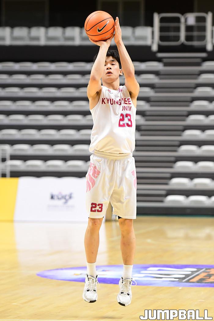 [점프볼=수원/박상혁 기자] 28일 서수원칠보체육관에서 열린 2021 KUSF 대학농구 U리그 경희대와 상명대의 경기, 경희대 이승구가 3점슛을 시도하고 있다.