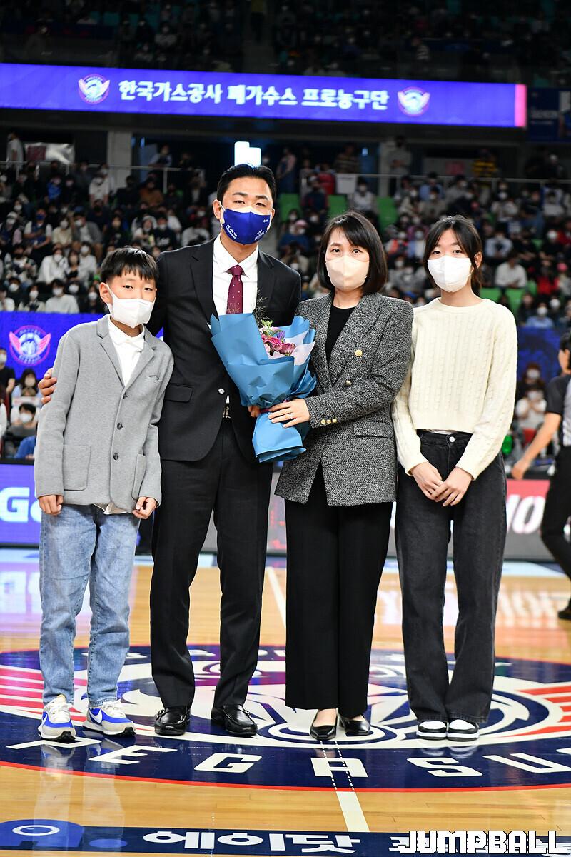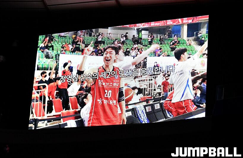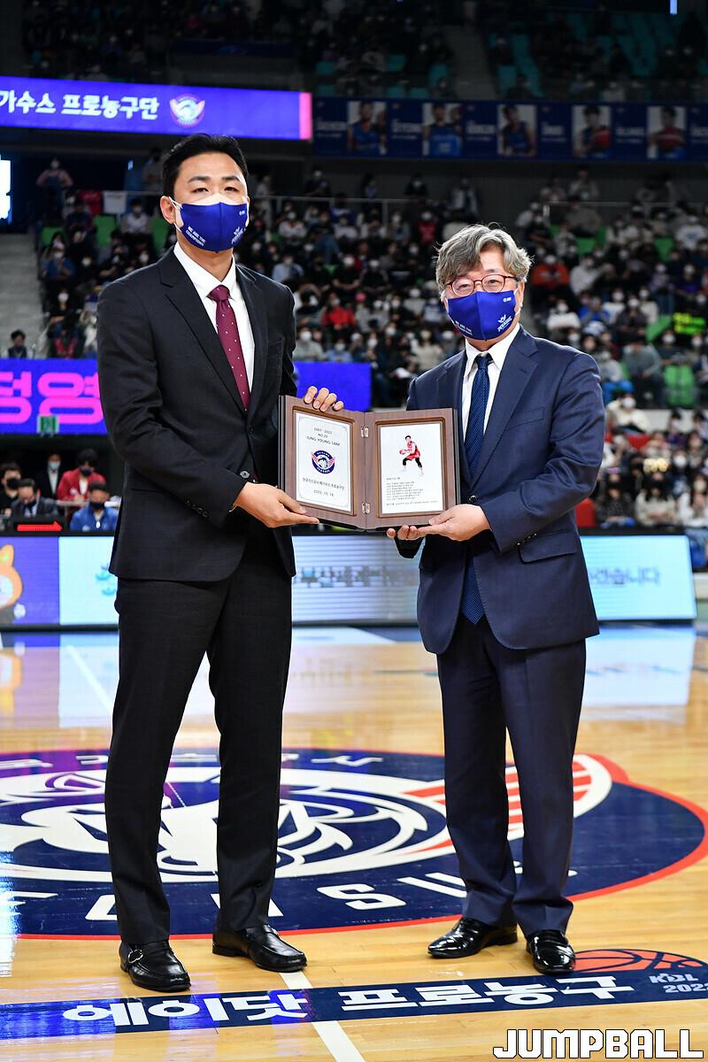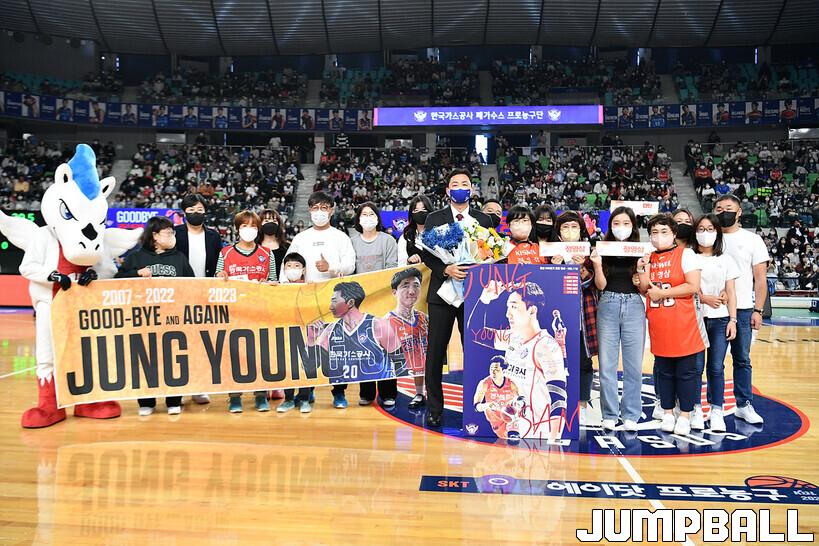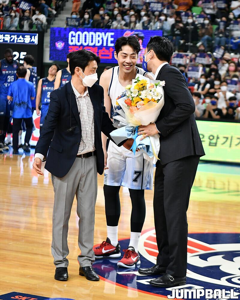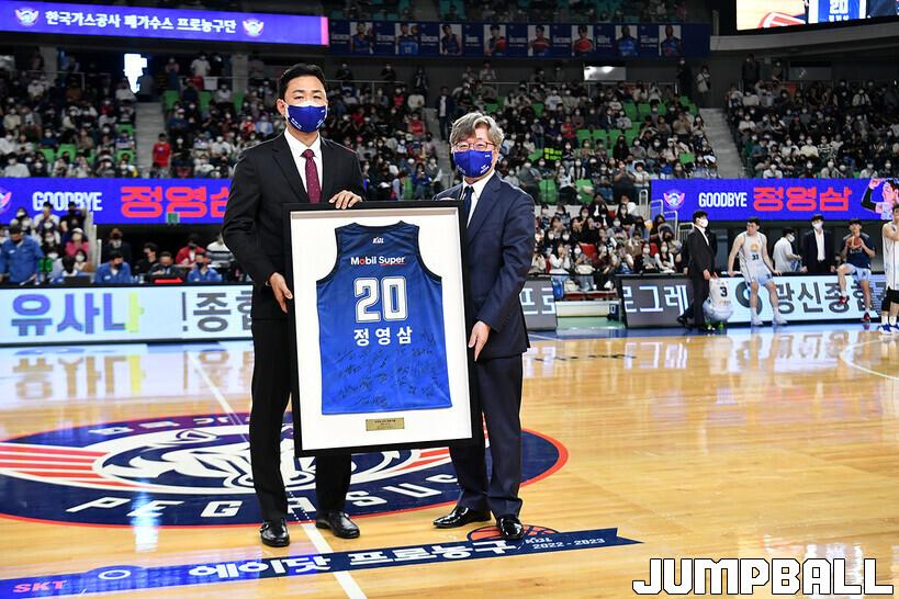 16일 대구실내체육관에서 열린 2022-2023 SKT 에이닷 프로농구 대구 한국가스공사와 전주 KCC의 경기의 하프타임에 정영삼 선수 은퇴식으로 감사패와 팬메세지액자 전달등 기념 행사를 진행했다.