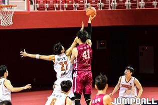 2일 경희대 국제캠퍼스 선승관에서 열린 2022 KUSF 대학농구 U-리그 경희대와 동국대의 플레이오프 8강전 경기, 동국대 유진이 3점슛을 성공시킨 후 벤치를 가리키고 있다.