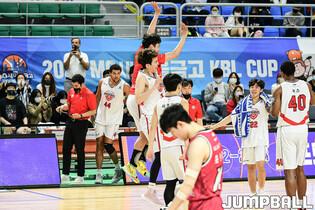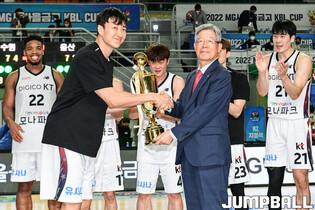 8일 통영체육관에서 열린 2022 MG새마을금고 울산현대모비스와 수원 KT의 결승전 경기, KT가 현대모비스에 74-72로 승리하며 컵대회 우승을 차지하였다. 우승팀 수원 KT와 준우승팀 울산 현대모비스가 단체 사진 촬영을 하고 있다.