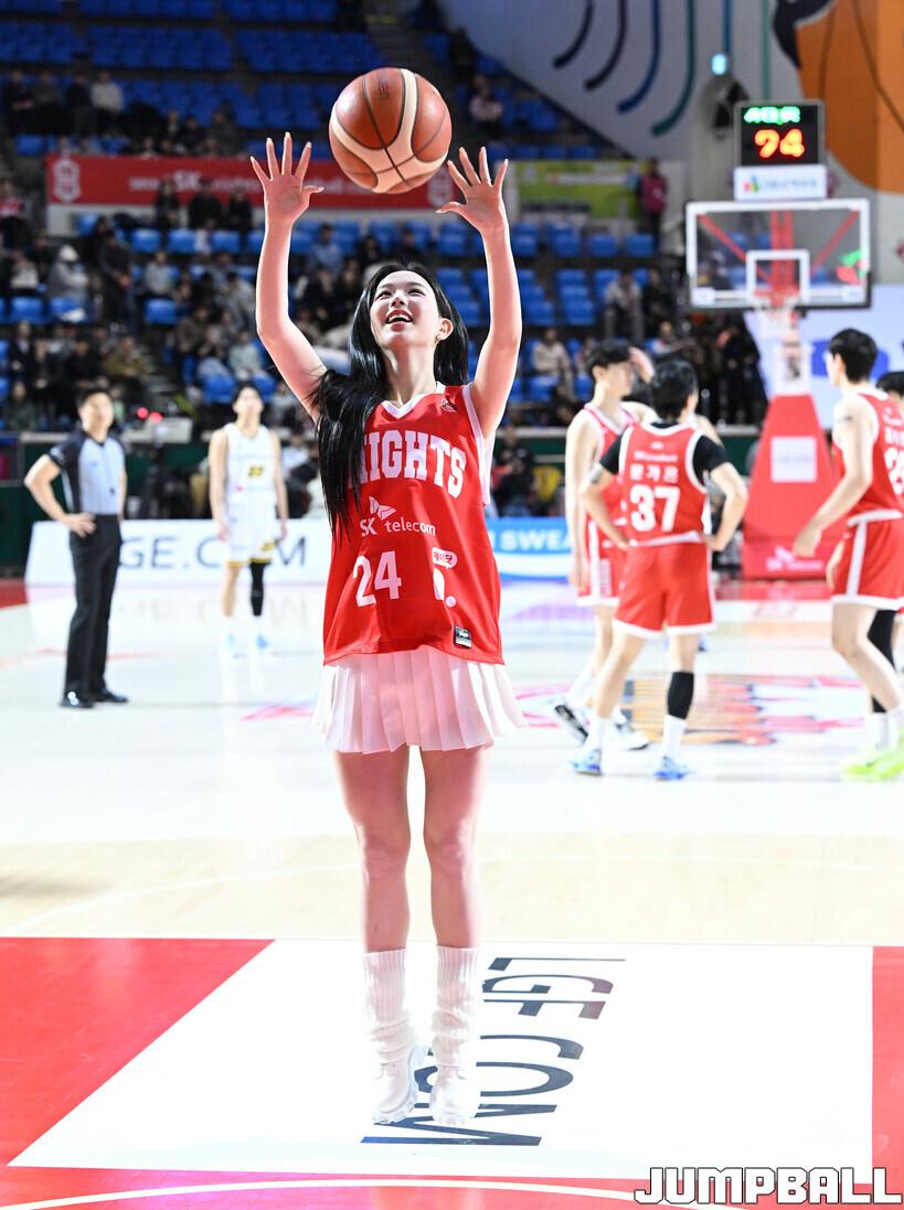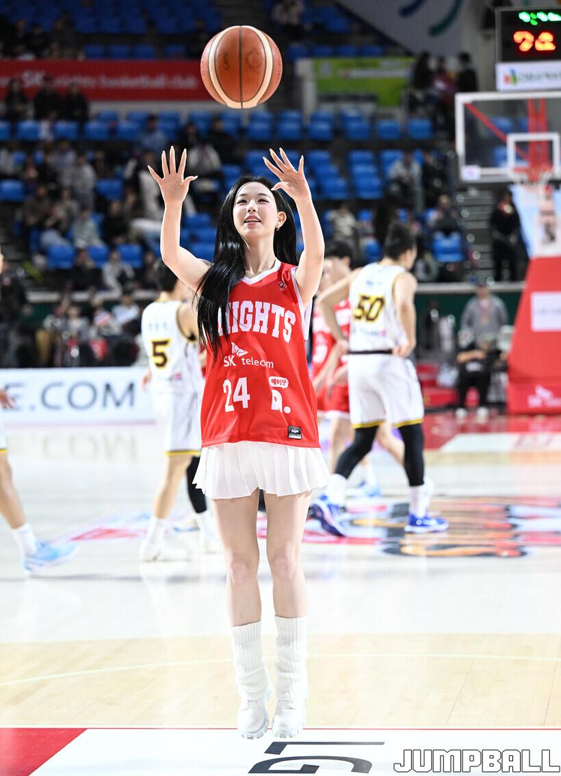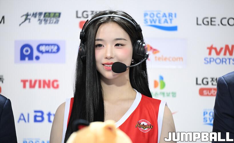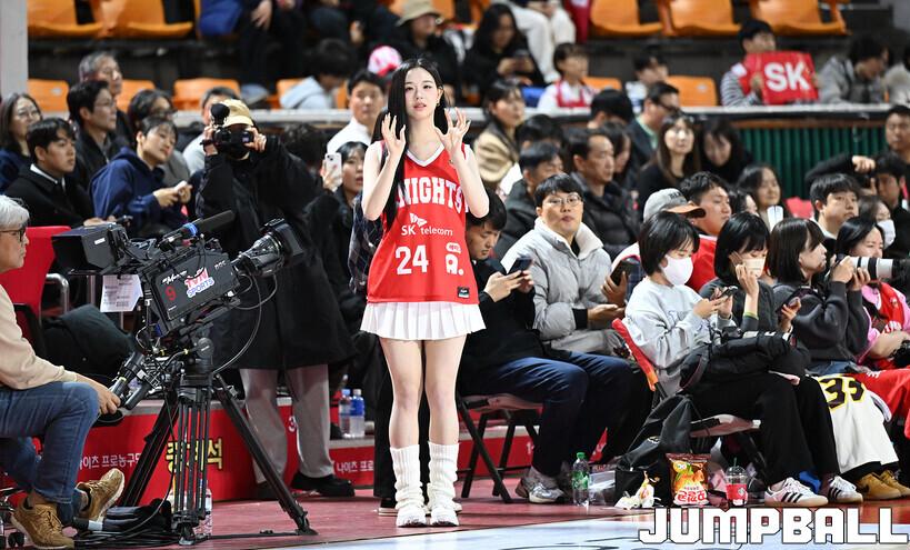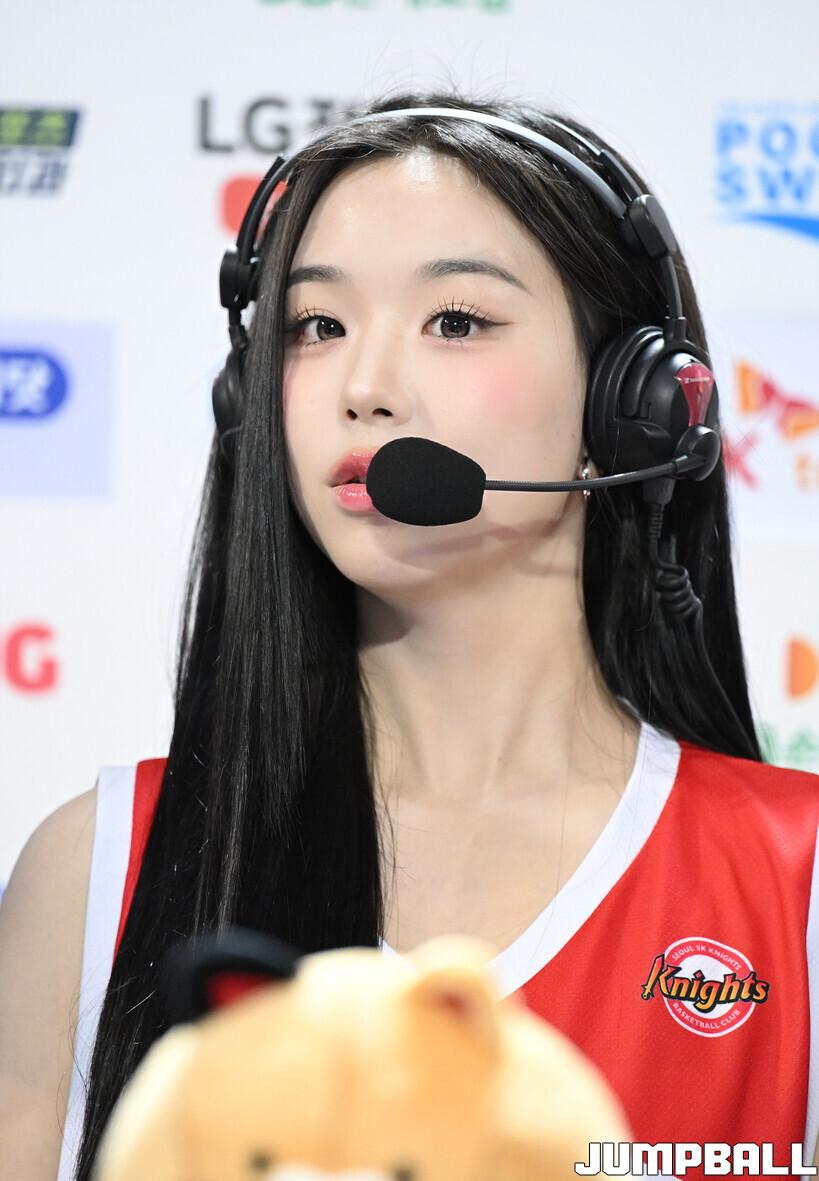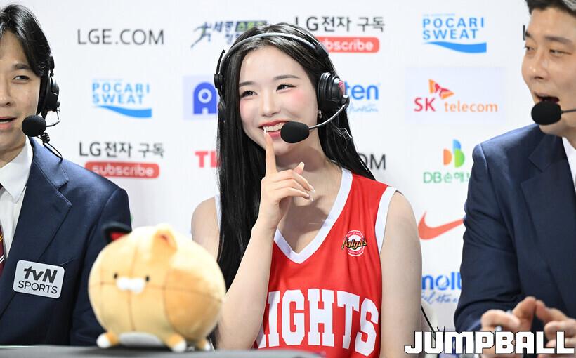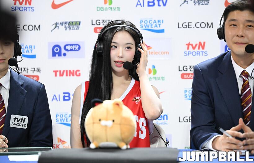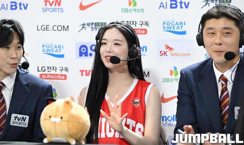 [점프볼=잠실학생/문복주 기자] 13일 잠실학생체육관에서 열린 2025-2026 LG전자 프로농구 정규시즌 서울 SK와 창원 LG의 경기에서 트리플에스 김채연이 경기전 시투와 하프타임에 tvN스포츠 중계를 했다.
