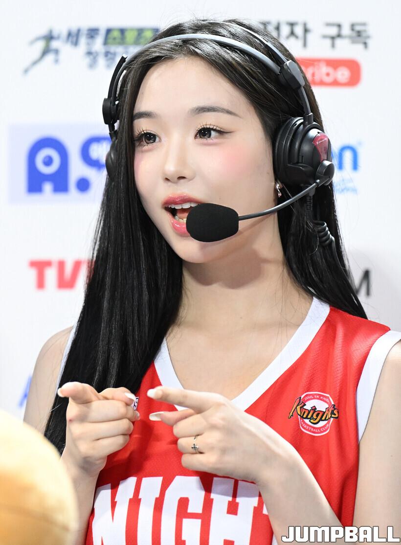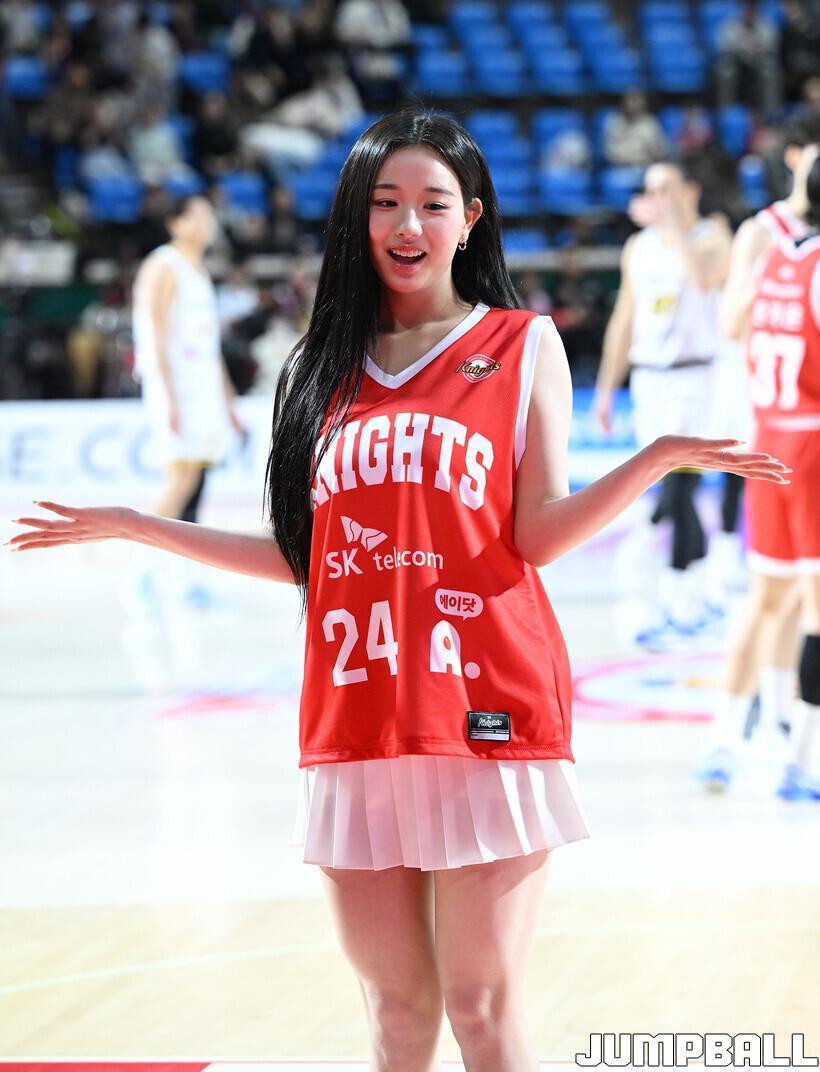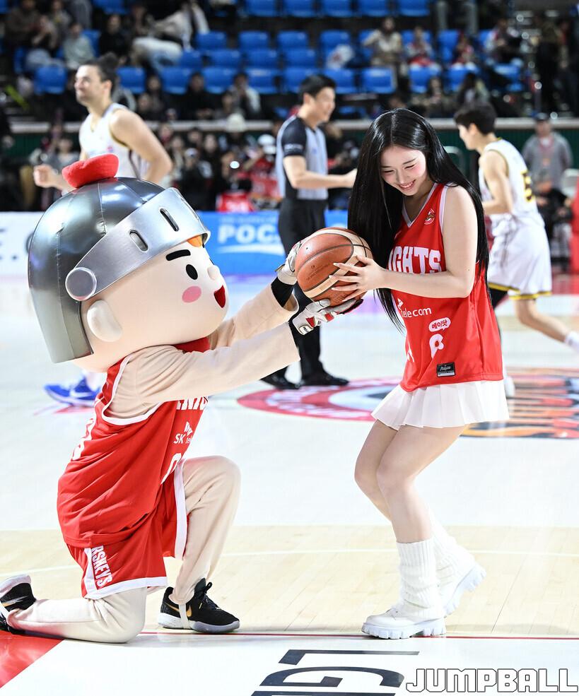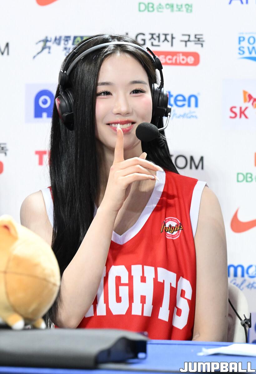 [점프볼=잠실학생/문복주 기자] 13일 잠실학생체육관에서 열린 2025-2026 LG전자 프로농구 정규시즌 서울 SK와 창원 LG의 경기에서 트리플에스 김채연이 경기전 시투와 하프타임에 tvN스포츠 중계를 했다.