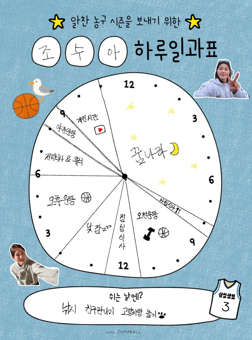 물론 100%는 없듯이 이 사례의 예외도 있다. 하루를 건강하게 보내고 다지는 삼성생명 가드 조수아가 그랬다. 농구와 확고한 취미 생활은, 에너지 넘치는 24시간을 책임지는 ‘친한 친구’다. “좋아하는 것을 이야기하니까 시간 가는 줄 모르겠네요”라며 당차게 웃은 조수아의 24시간 속으로 걸어가 보자.