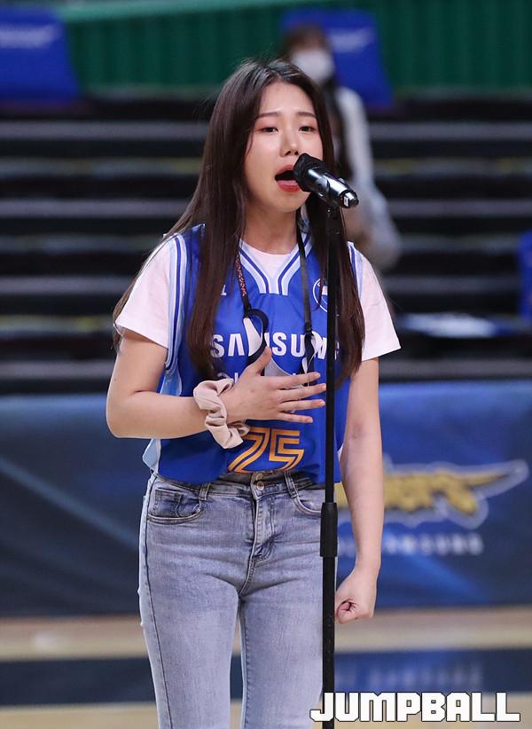 [점프볼=잠실/백승철 기자] 13일 서울 잠실실내체육관에서 열린 2020-2021 현대모비스 프로농구 서울 삼성과 울산 현대모비스의 경기, 가수 송하예가 애국가를 부르고 있다.