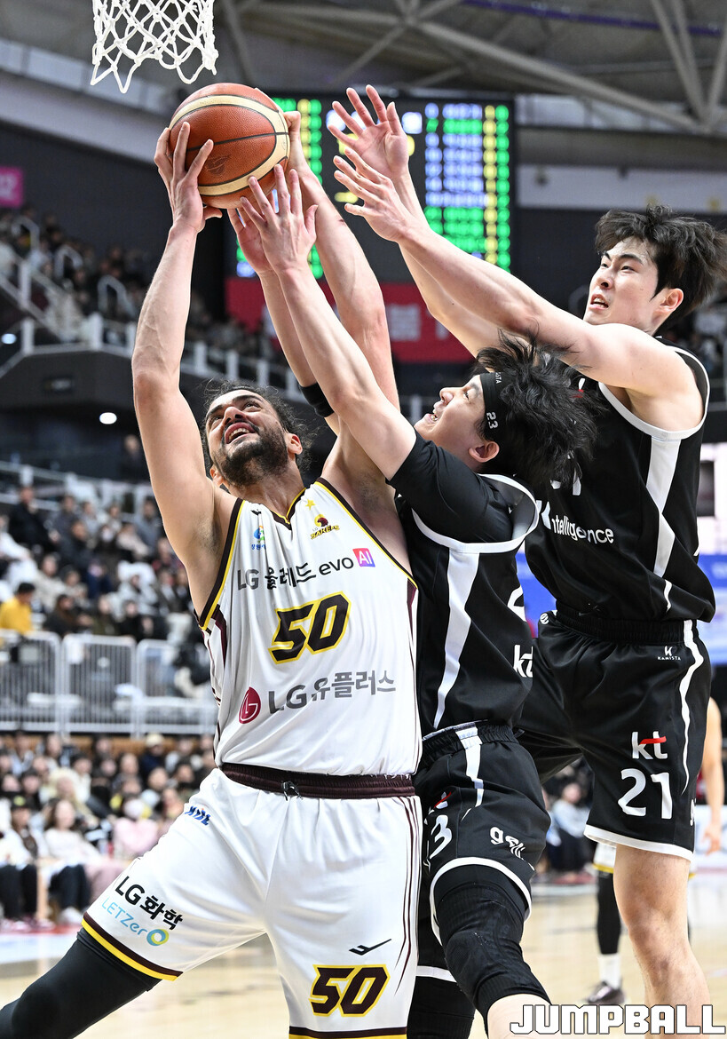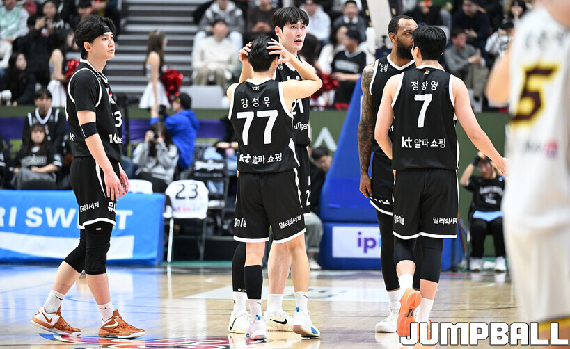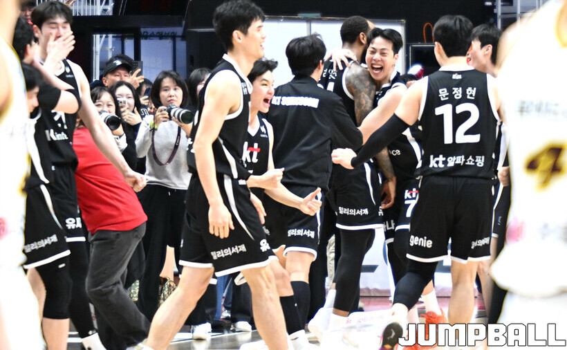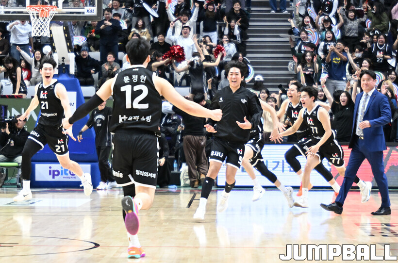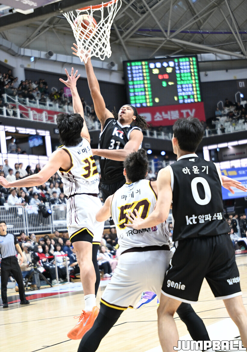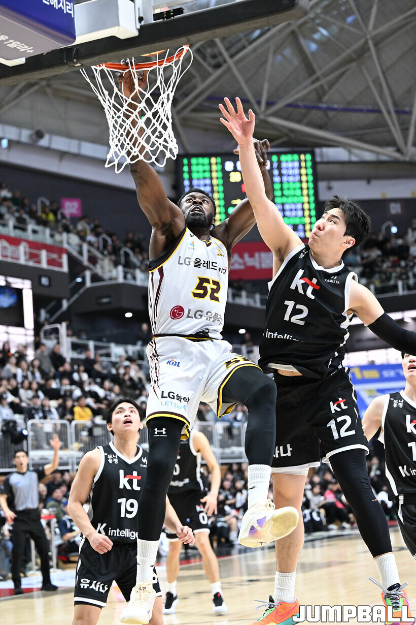 [점프볼=수원/문복주 기자] 수원 KT는 4일 수원 KT 소닉붐 아레나에서 2025-2026 LG전자 프로농구 정규시즌 창원 LG와 4라운드 맞대결에서 76-75로 승리했다. KT의 데릭 윌리엄스가 21점 5리바운드로 승리를 이끌고 특히 경기 종료 1.7초를 남기고 역전 위닝샷을 터트리며 주인공이 되었다.