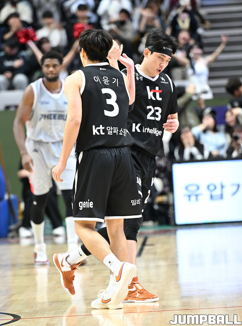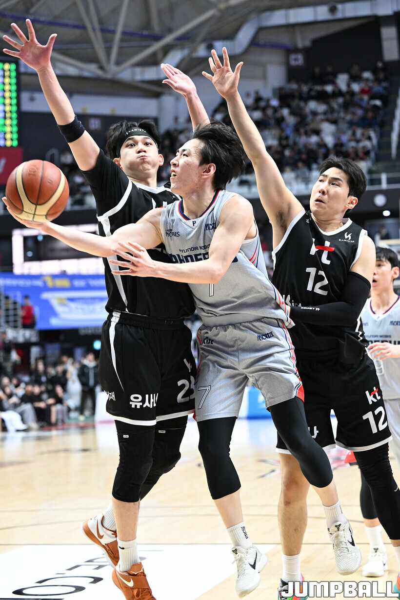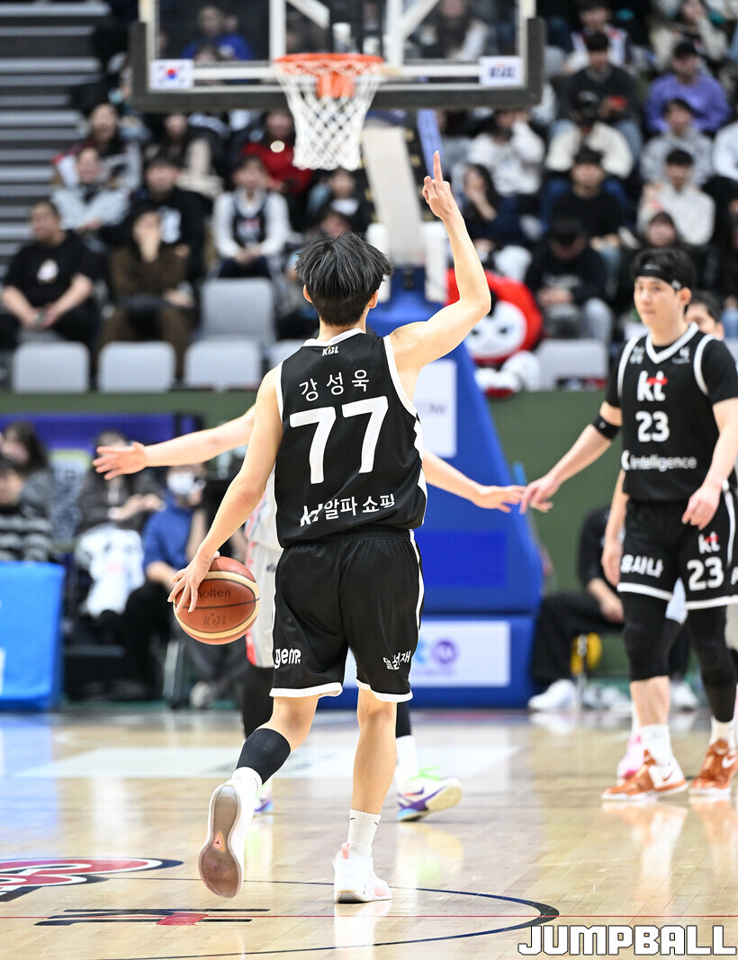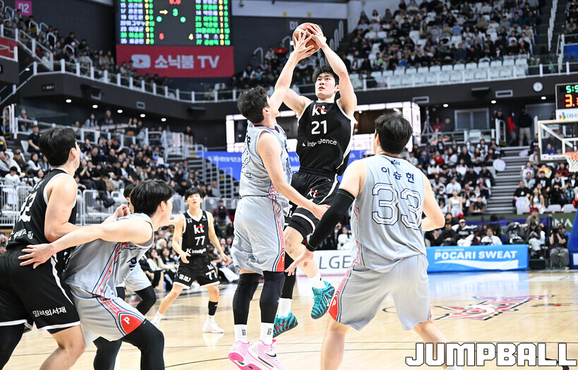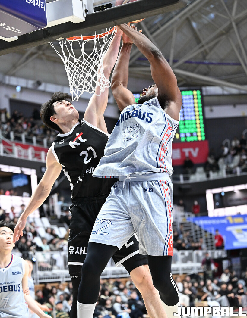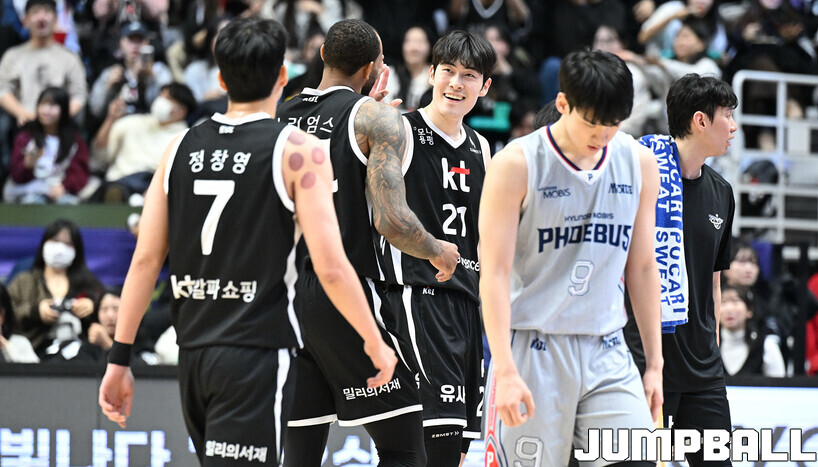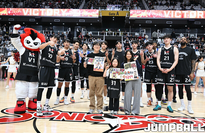 [점프볼=수원/문복주 기자] 수원 KT는 11일 수원 KT 소닉붐 아레나에서 열린 울산 현대모비스와의 2025-2026 LG전자 프로농구 정규시즌 홈경기에서 74-58로 승리했다. KT의 데릭 윌리엄스(16점 5리바운드 3어시스트 2스틸), 강성욱(12점 3리바운드 6어시스트 2스틸)은 2경기 연속 두 자리 득점을 기록했다.