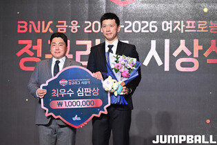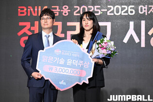 [점프볼=용산/문복주 기자] 6일 용산구 서울드래곤시티 그랜드볼룸 한라홀 3층에서 260406 BNK금융 2025-2026 여자프로농구 정규리그 시상식, 우수수비선수상 삼성생명 이해란이 수상을 했다.