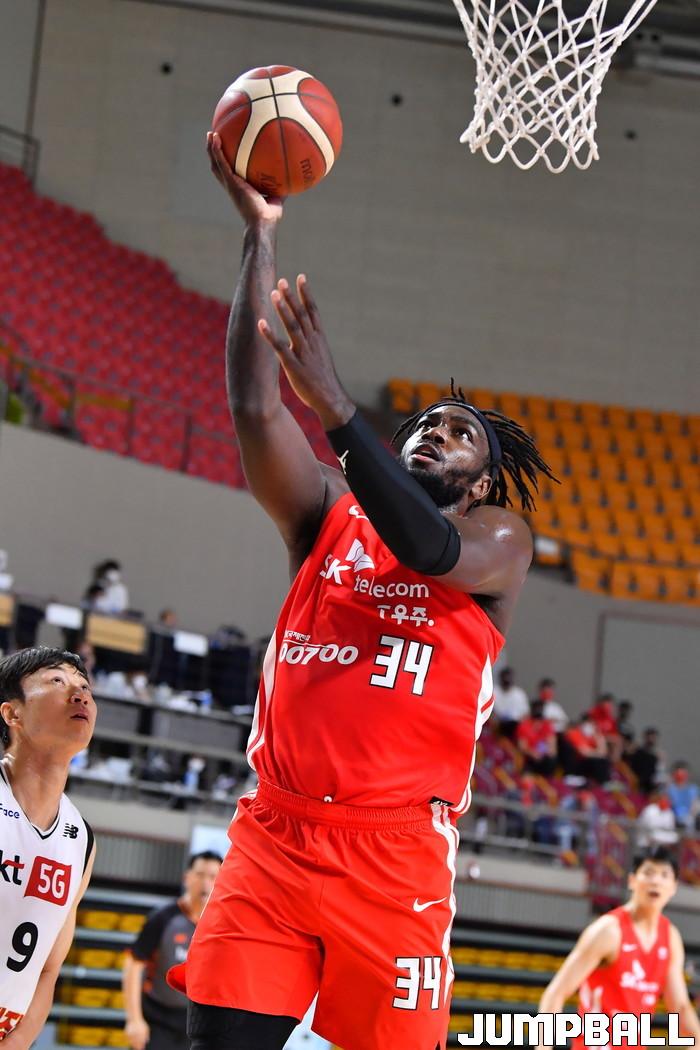 17일 경상북도 상주시 상주실내체육관에서 열린 2021 MG새마을금고 KBL컵 대회 수원 KT와 서울 SK의 4강 경기, SK 자밀 워니가 레이업을 올려넣고 있다.