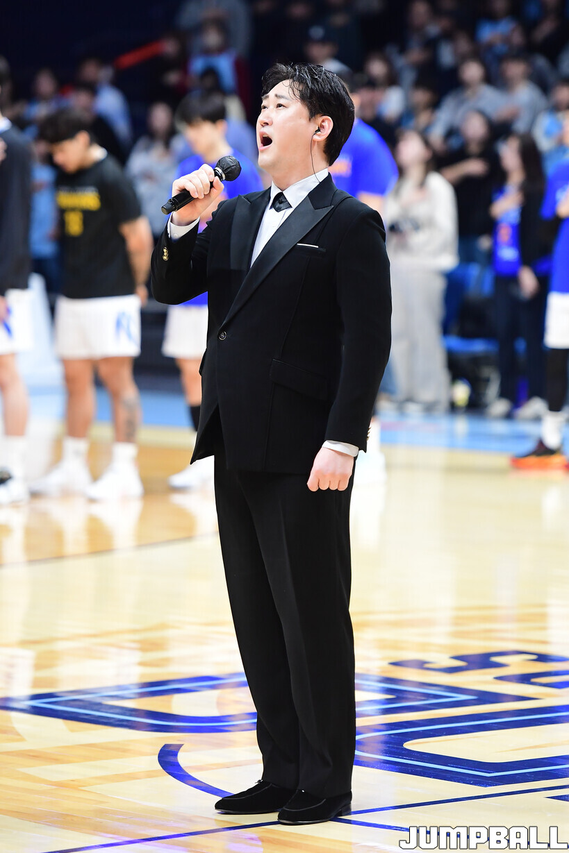 [점프볼=고양/박상혁 기자] 15일 고양 소노 아레나에서 열린 2025-2026 LG전자 프로농구 고양 소노와 서울 삼성의 경기, 슈퍼테너 양승호가 애국가를 제창하고 있다.