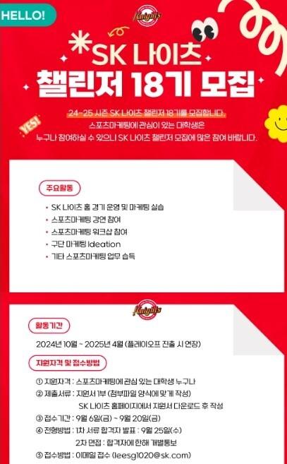 챌린저는 스포츠 마케팅에 관심 있는 대학생들로 구성되며, 2024-2025시즌 동안 SK의 홈경기 운영과 소셜미디어 콘텐츠 제작, 마케팅 지원 등 스포츠 마케팅을 현장에서 직접 체험하게 된다. 챌린저의 활동 기간은 오는 10월부터 2024-2025시즌이 종료될 때까지며, 약 30명으로 운영될 예정이다.