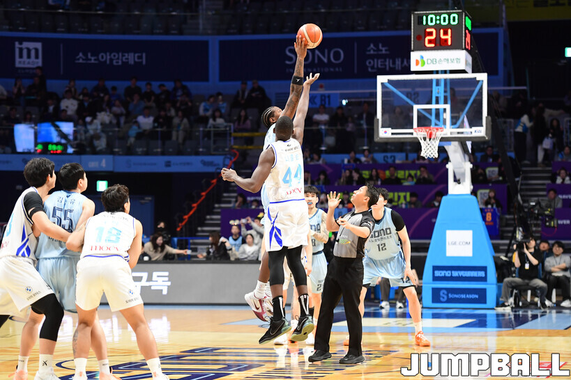 [점프볼=고양/박상혁 기자] 15일 고양 소노 아레나에서 열린 2025-2026 LG전자 프로농구 고양 소노와 서울 삼성의 경기, 점프볼로 경기가 시작되었다.