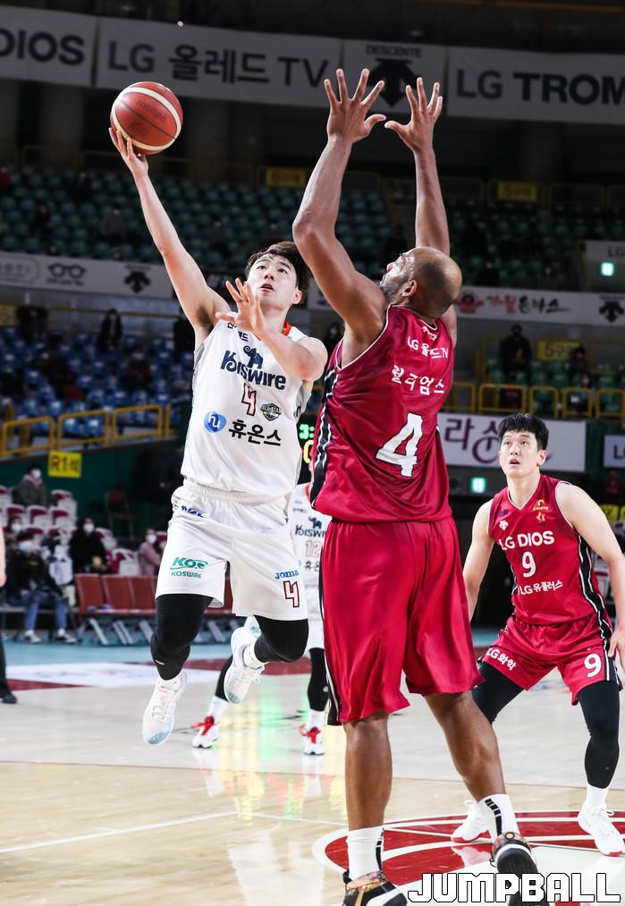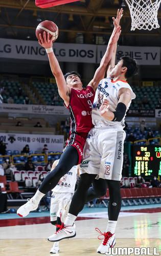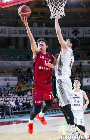 [점프볼=윤민호 기자] 31일 창원 실내체육관에서 열린 2020-2021 현대모비스 프로농구 창원 LG와 인천 전자랜드의 경기에서 전자랜드 김낙현이 LG 윌리엄스의 수비를 피해 슛을 하고 있다.