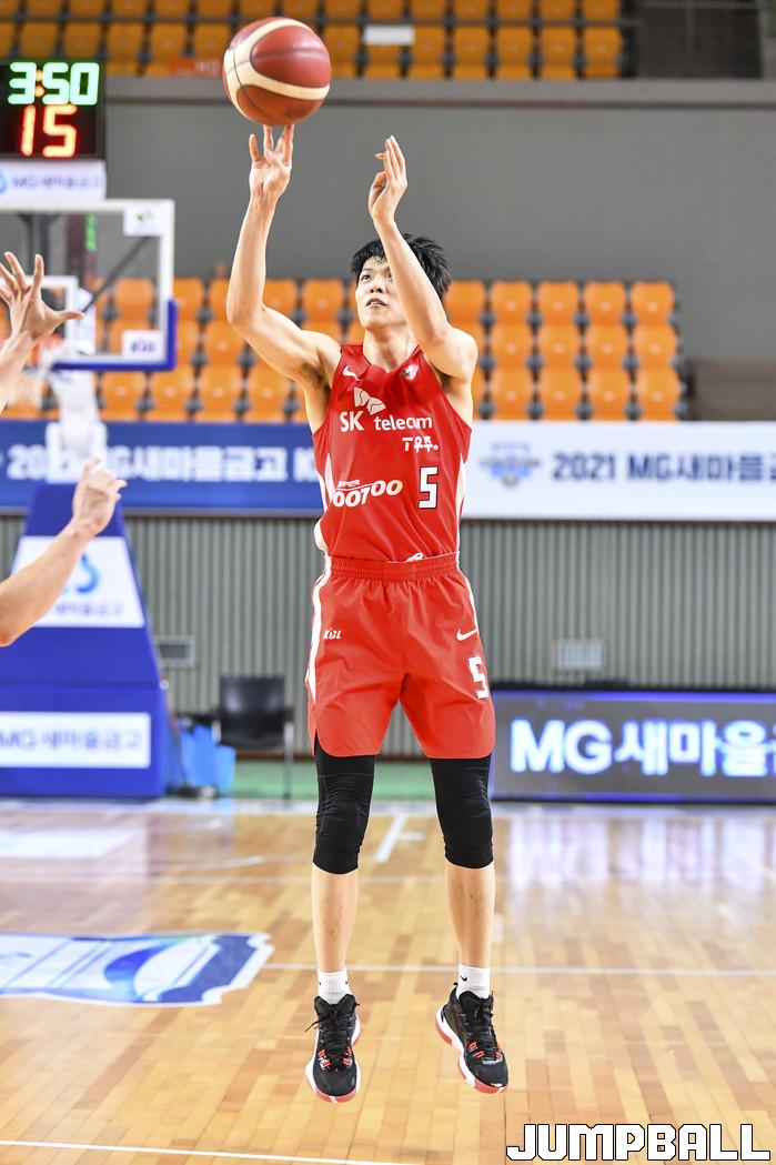 17일 경상북도 상주시 상주실내체육관에서 열린 2021 MG새마을금고 KBL컵 대회 수원 KT와 서울 SK의 4강 경기, SK 김선형이 3점슛을 던져 득점에 성공시키고 있다.