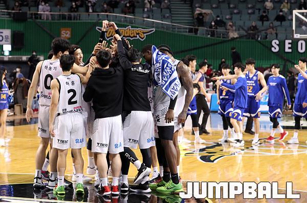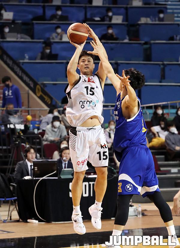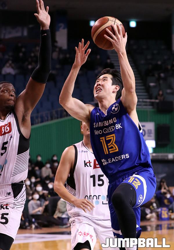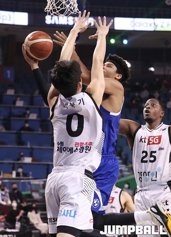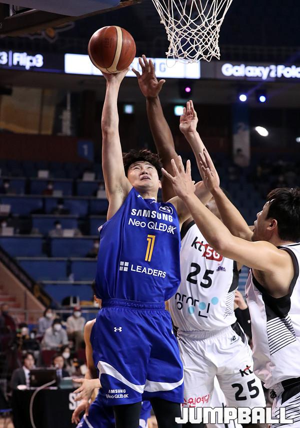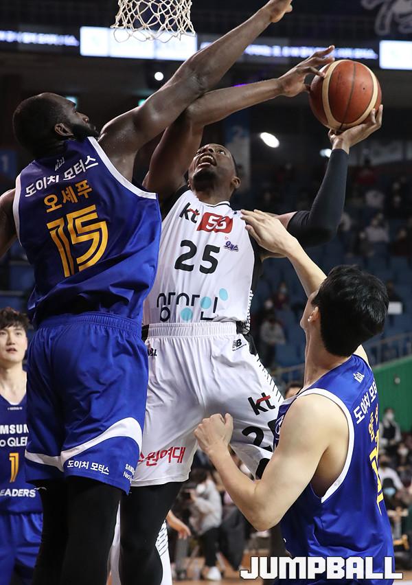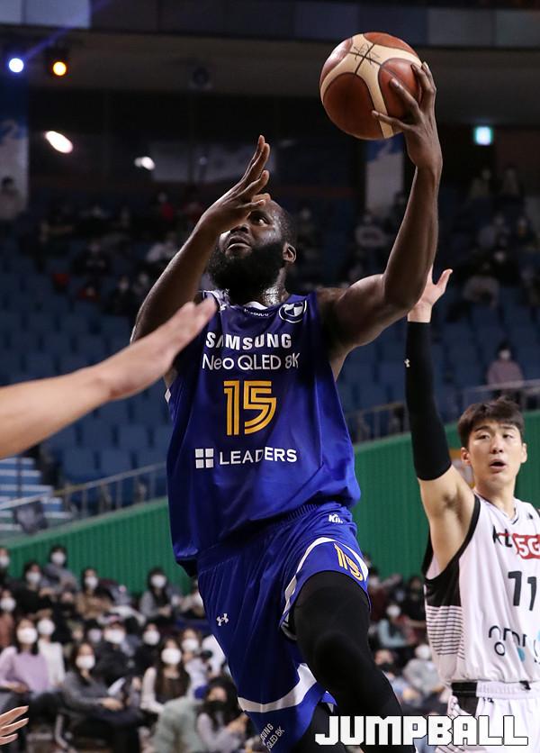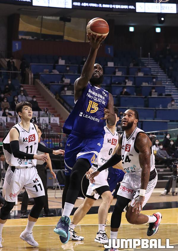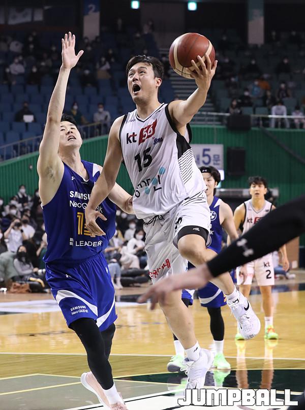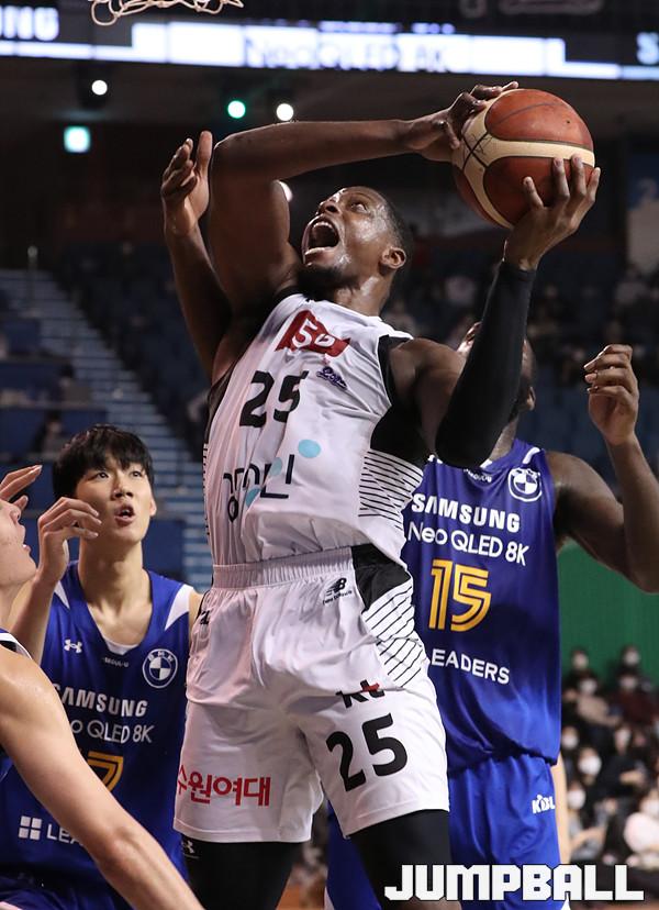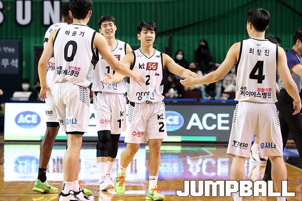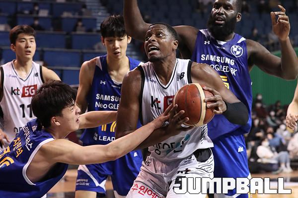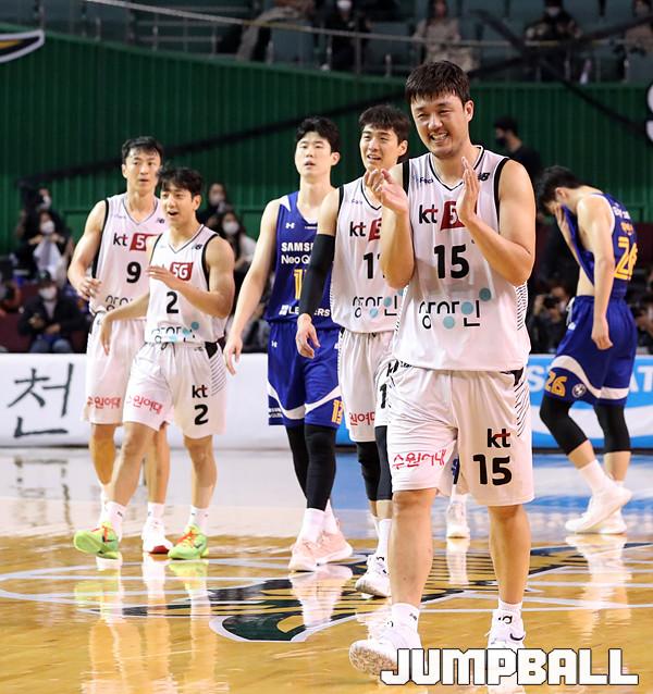 수원 KT는 21일 잠실체육관에서 열린 2021-2022 KGC 인삼공사 정관장 프로농구 서울 삼성과의 원정 경기에서 67-58로 승리했다. 4연승을 달린 KT는 10승 5패가 되면서 공동 1위에 도약했다.
