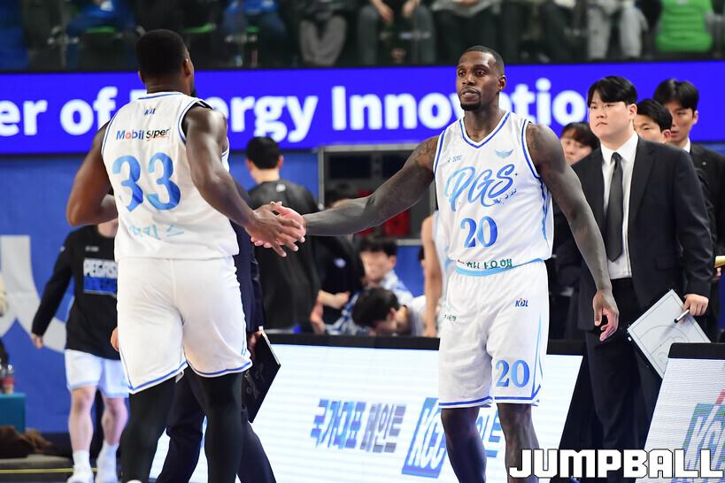 [점프볼=대구/박상혁 기자] 13일 대구체육관에서 열린 2025-2026 LG전자 프로농구 대구 한국가스공사와 원주 DB의 경기, 한국가스공사 라건아가 퍼킨스와 하이파이브를 하고 있다.