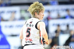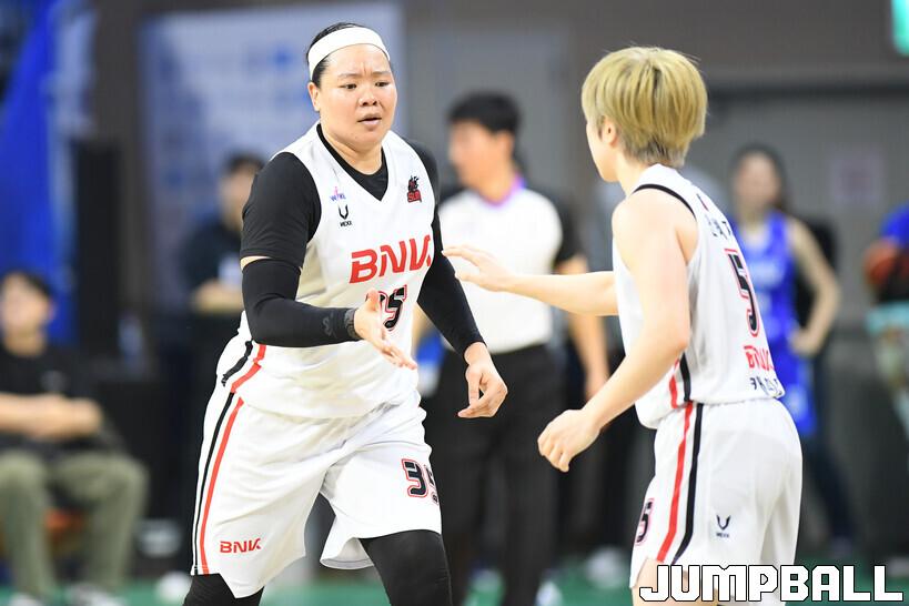 [점프볼=아산/박상혁 기자] 5일 아산이순신체육관에서 열린 우리은행 우리WON 2023-2024 여자프로농구 아산 우리은행과 부산 BNK썸의 경기, BNK썸 김한별이 안혜지와 하이파이브를 하고 있다.