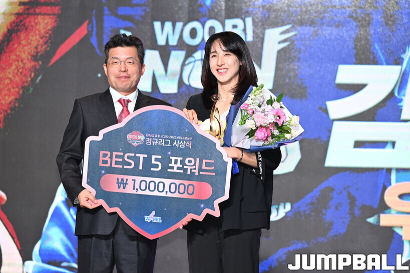 [점프볼=용산/문복주 기자] 6일 용산구 서울드래곤시티 그랜드볼룸 한라홀 3층에서 260406 BNK금융 2025-2026 여자프로농구 정규리그 시상식, 베스트5 포워드 우리은행 김단비가 수상을 했다.