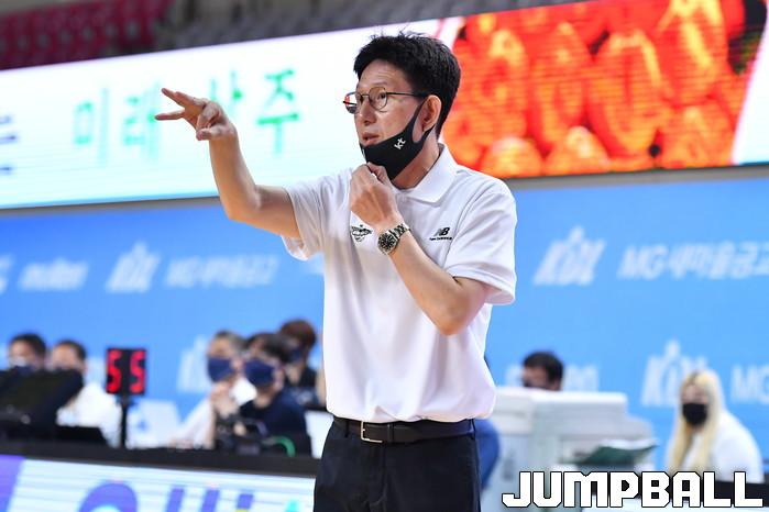 17일 경상북도 상주시 상주실내체육관에서 열린 2021 MG새마을금고 KBL컵 대회 수원 KT와 서울 SK의 4강 경기, KT 서동철 감독이 코트 위 선수들에게 작전을 지시하고 있다.