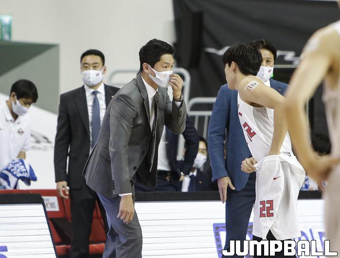 [점프볼=정을호 기자] 19 울산동천체육관에서 열린 2020-2021 현대모비스 프로농구 울산 현대모비스와 서울 SK 경기, SK 전희철 코치가 오재현에게 작전지시를 하고있다.