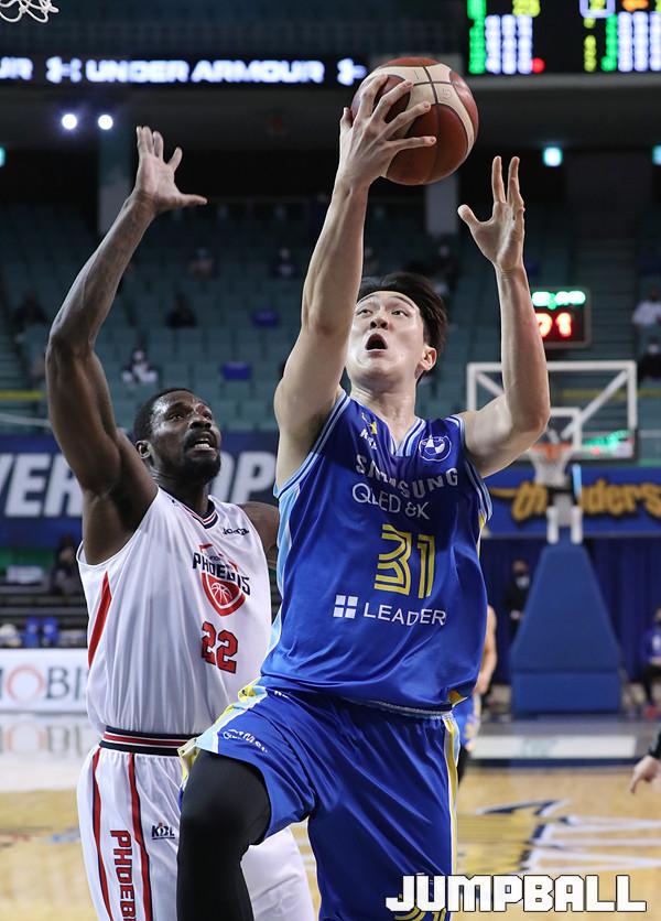 [점프볼=잠실/백승철 기자] 13일 서울 잠실실내체육관에서 열린 2020-2021 현대모비스 프로농구 서울 삼성과 울산 현대모비스의 경기, 삼성 김준일이 슛을 시도하고 있다.