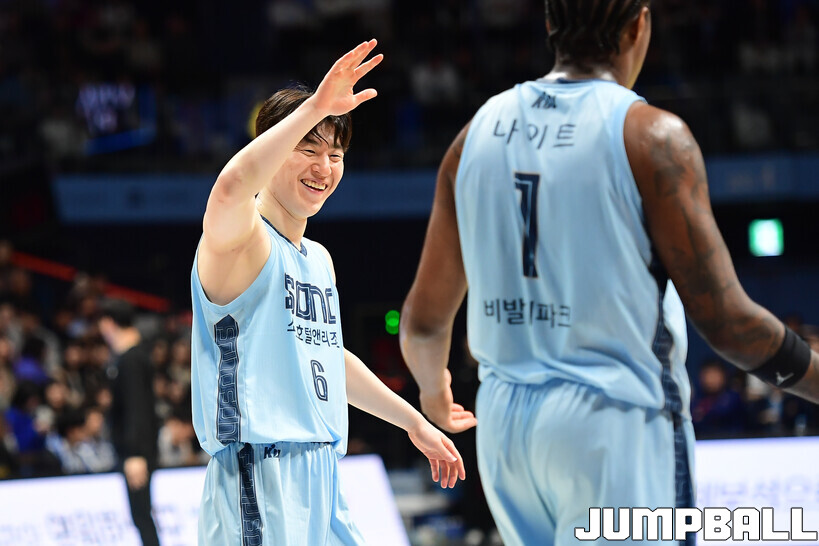 [점프볼=고양/박상혁 기자] 15일 고양 소노 아레나에서 열린 2025-2026 LG전자 프로농구 고양 소노와 서울 삼성의 경기, 소노 이정현이 나이트와 하이파이브를 하고 있다.