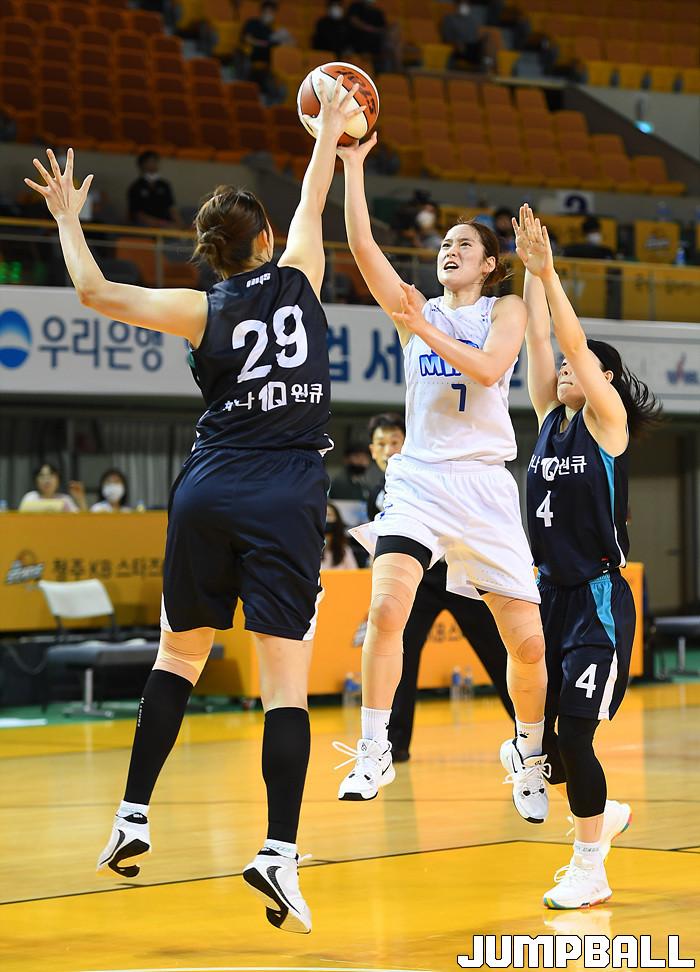 [점프볼=청주/문복주 기자] 17일 청주체육관에서 열린 '2020 우리은행 박신자컵 서머리그' 하나원큐와 삼성생명의 경기, 하나원큐 이정현이 삼성생명 이민지의 슛을 블로킹하고 있다.