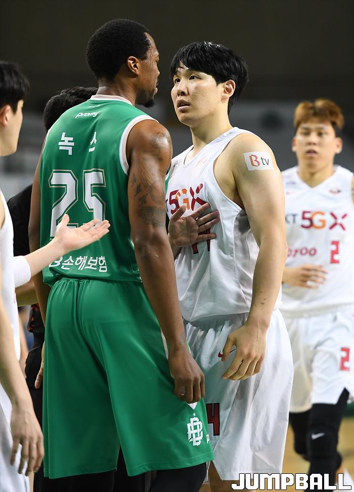 [점프볼=원주/문복주 기자] 15일 원주종합체육관에서 열린 2020-2021 현대모비스 프로농구 원주 DB와 서울 SK의 경기, DB 녹스와 SK 최부경이 신경전을 펼치고 있다.