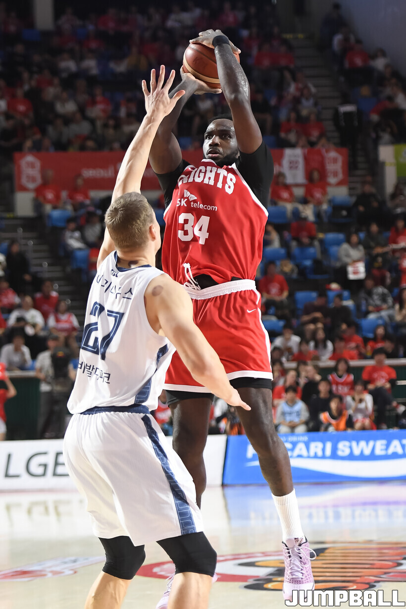 [점프볼=잠실학생/박상혁 기자] 12일 잠실학생체육관에서 열린 2025-2026 LG전자 프로농구 서울 SK와 고양 소노의 6강 플레이오프 1차전 경기, SK 자밀 워니가 슛을 시도하고 있다.