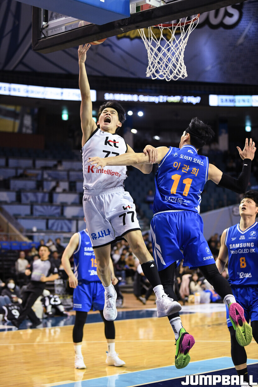 [점프볼=잠실/유용우 기자] 24일 잠실실내체육관에서 열린 2025-2026 LG전자 프로농구 서울 삼성과 수원 KT의 경기, KT 강성욱이 파고 들며 공격을 시도하고 있다.