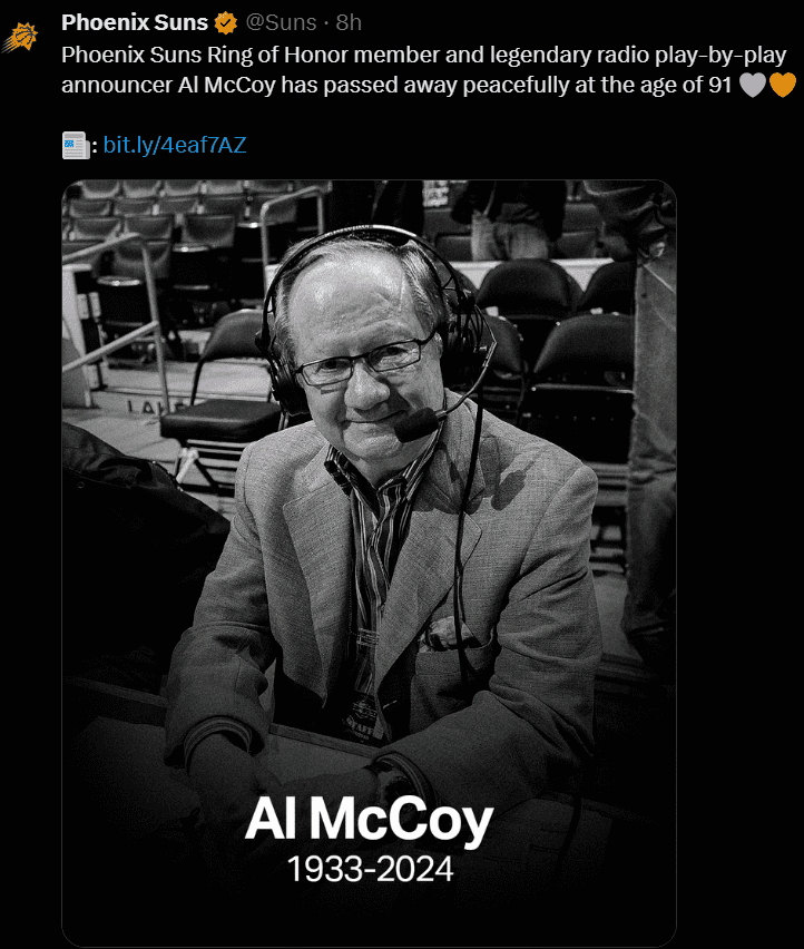 피닉스 구단은 공식 소셜미디어를 통해 “매코이는 51년 동안 '태양의 목소리'를 맡았다. 구단의 결정적인 인물이었다. 그의 목소리, 열정, 기쁨은 전설적이었다. 역사상 기억에 남는 순간을 조명했고, 여러 세대의 팬들을 한데 불러 모았다. 가장 위대한 사운드였다. 우리 조직의 심장부이자 소중한 친구, 멘토였다”라고 애도했다.
