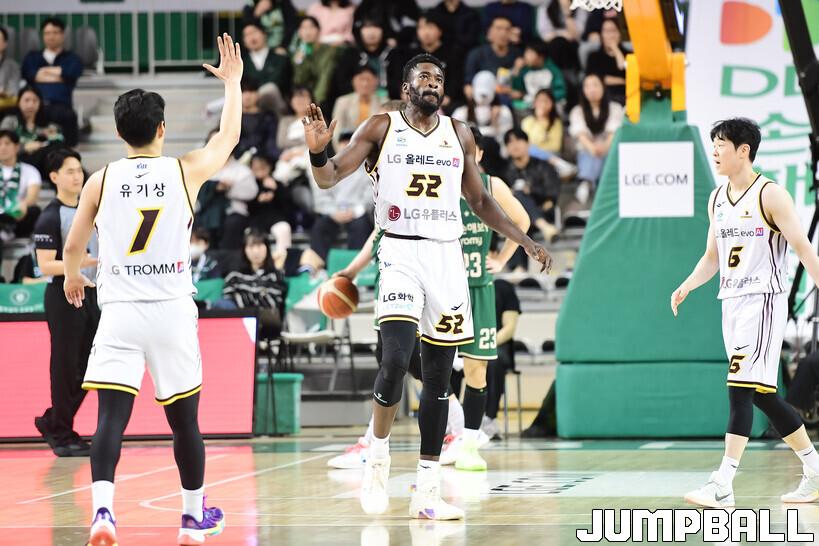 [점프볼=원주/박상혁 기자] 8일 원주 DB 프로미 아레나에서 열린 2025-2026 LG전자 프로농구 원주 DB와 창원 LG의 경기, LG 마이클 에릭이 유기상과 하이파이브를 하고 있다.