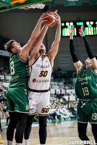 [점프볼=원주/유용우 기자] 15일 원주 DB 프로미 아레나에서 열린 2025-2026 LG전자 프로농구 원주 DB과 창원 LG의 경기, LG 마이클 에릭이 리바운드를 잡고 있다.