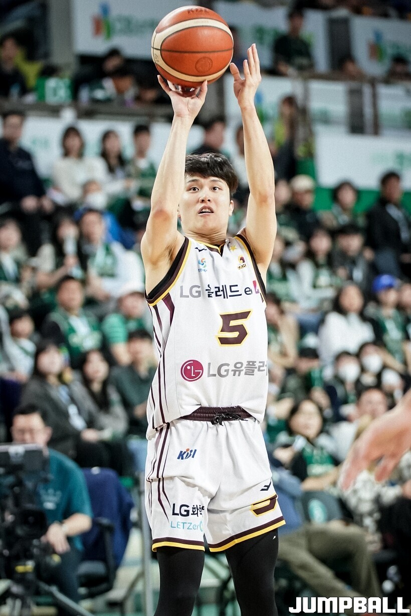 [점프볼=원주/유용우 기자] 15일 원주 DB 프로미 아레나에서 열린 2025-2026 LG전자 프로농구 원주 DB과 창원 LG의 경기, LG 양준석이 3점슛을 던지고 있다.