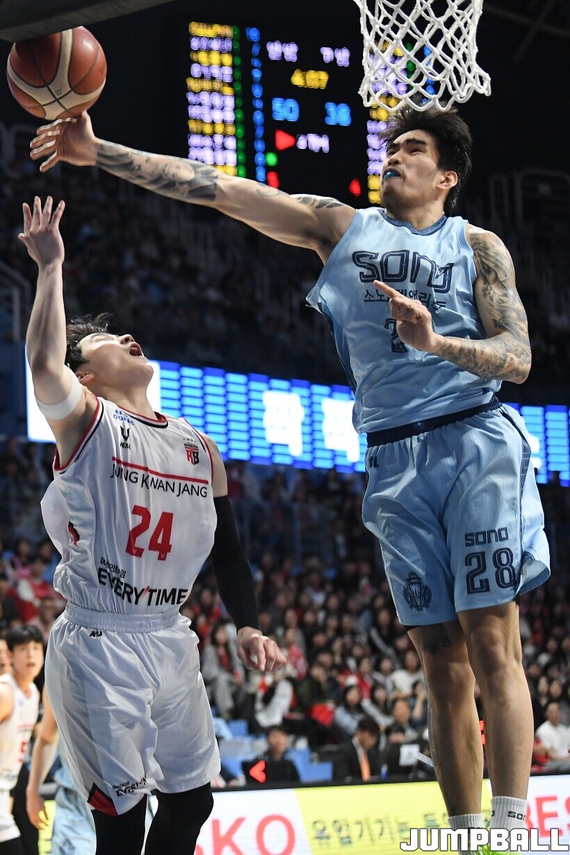 [점프볼=고양/유용우 기자] 5일 고양 소노아레나에서 열린 2025-2026 LG전자 프로농구 고양 소노와 안양 정관장의 경기, 소노 케빈 켐바오가 정관장 문유현의 슛을 블록으로 저지하고 있다.