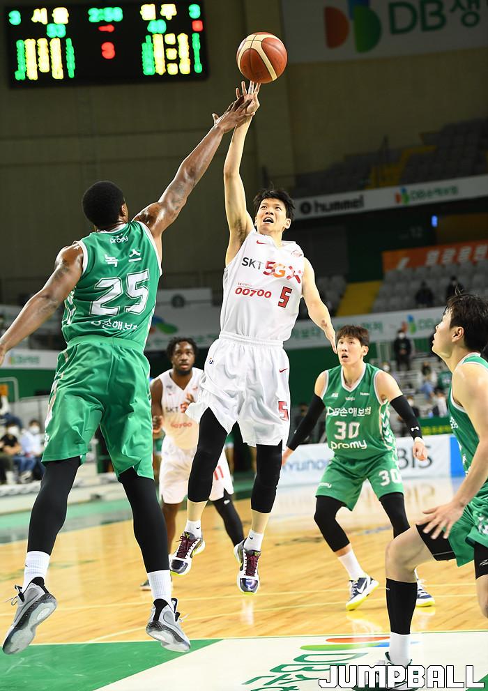 [점프볼=원주/문복주 기자] 15일 원주종합체육관에서 열린 2020-2021 현대모비스 프로농구 원주 DB와 서울 SK의 경기, SK 김선형이 간발의 차이로 슛을 던지고 있다.