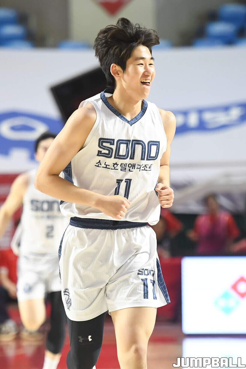 [점프볼=잠실학생/박상혁 기자] 12일 잠실학생체육관에서 열린 2025-2026 LG전자 프로농구 서울 SK와 고양 소노의 6강 플레이오프 1차전 경기, 소노 이근준이 3점슛을 성공한 후 벤치를 바라보며 미소를 짓고 있다.