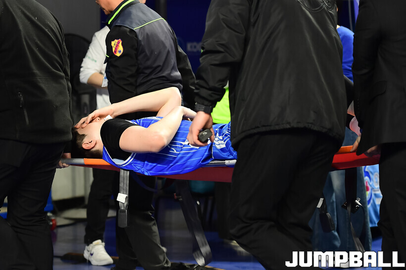 [점프볼=대구/박상혁 기자] 17일 대구체육관에서 열린 2025-2026 LG전자 프로농구 대구 한국가스공사와 수원 KT의 경기, 한국가스공사 김준일이 부상으로 인해 들것에 실려 코트 밖으로 나가고 있다.