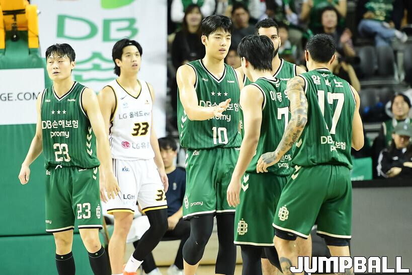[점프볼=원주/박상혁 기자] 8일 원주 DB 프로미 아레나에서 열린 2025-2026 LG전자 프로농구 원주 DB와 창원 LG의 경기, DB 김보배가 이용우와 하이파이브를 하고 있다.