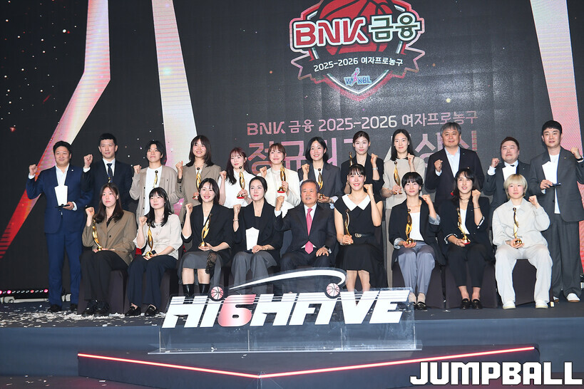 [점프볼=용산/문복주 기자] 6일 용산구 서울드래곤시티 그랜드볼룸 한라홀 3층에서 260406 BNK금융 2025-2026 여자프로농구 정규리그 시상식, 수상자 단체 사진을 진행 했다.