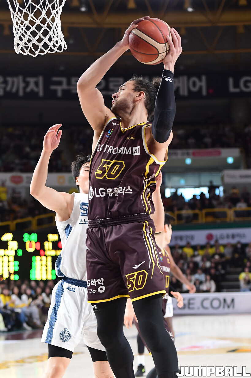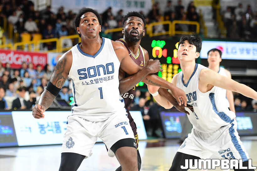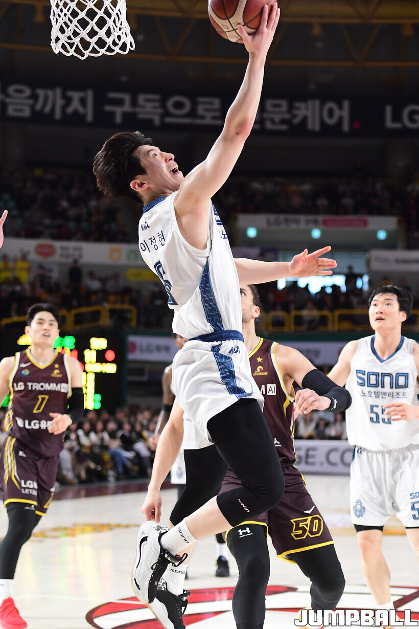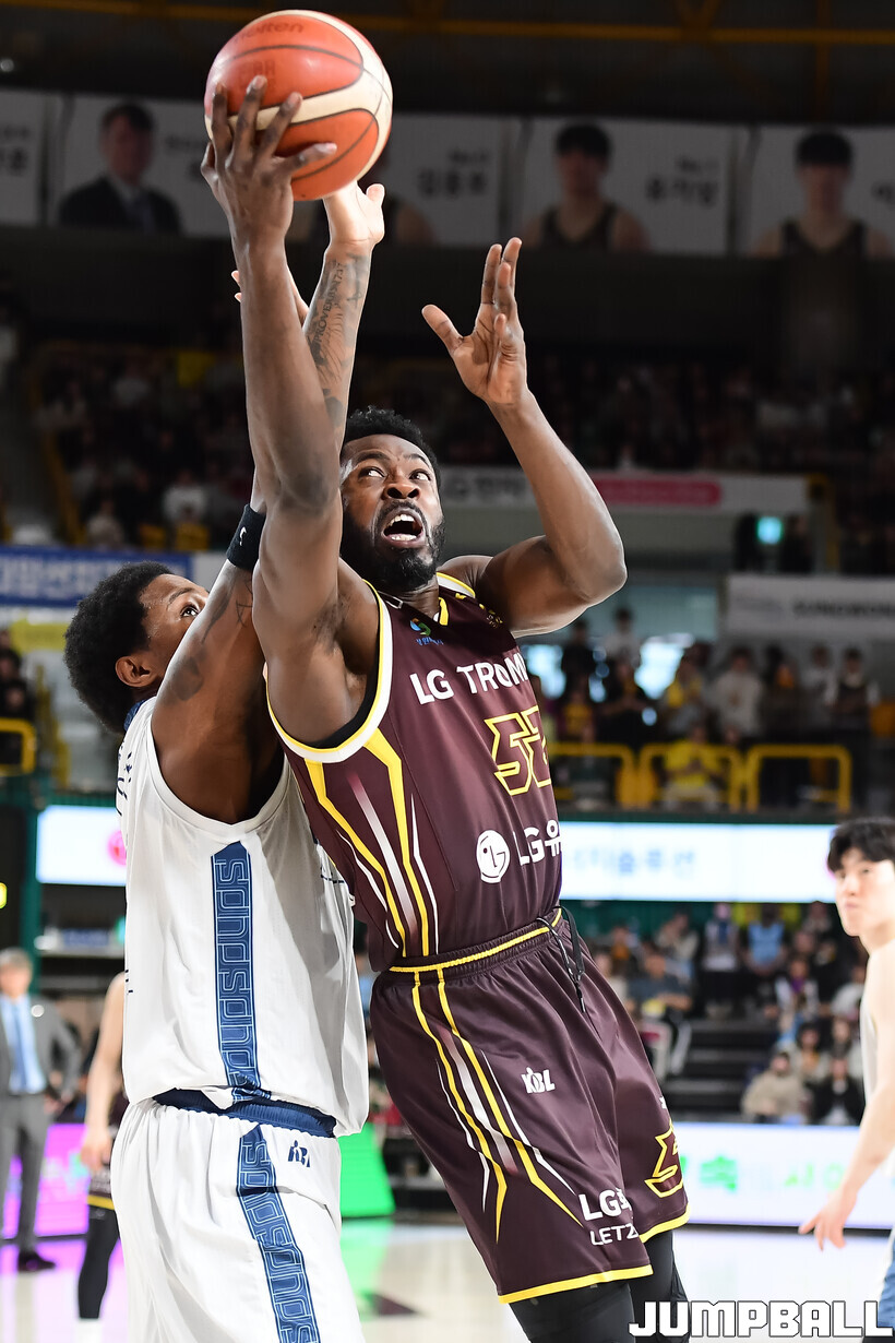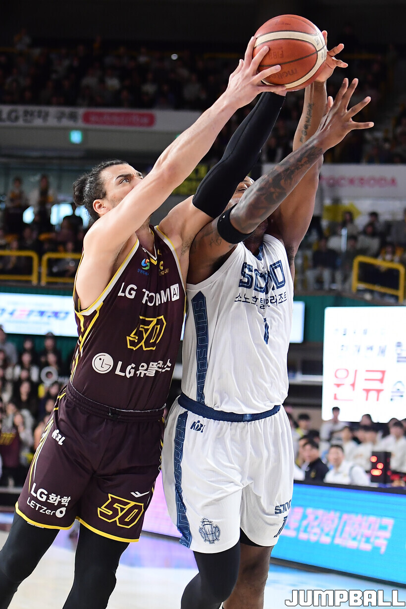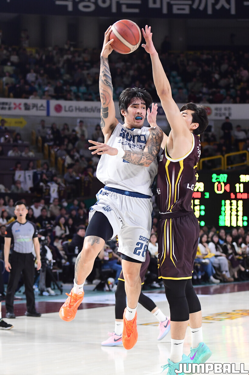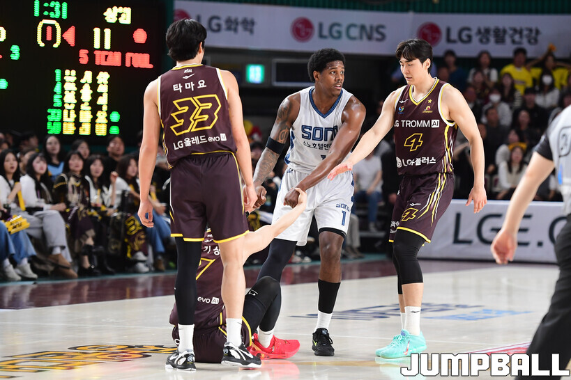 [점프볼=창원/박상혁 기자] 16일 창원체육관에서 열린 2025-2026 LG전자 프로농구 창원 LG와 고양 소노의 경기, 소노가 나이트와 켐바오, 이정현이의 활약으로 아셈 마레이가 분전한 LG에 79-62로 승리했다.