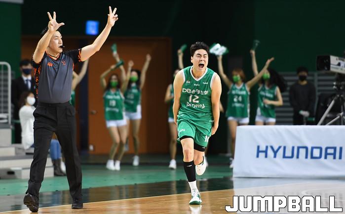 [점프볼=원주/문복주 기자] 15일 원주종합체육관에서 열린 2020-2021 현대모비스 프로농구 원주 DB와 서울 SK의 경기, DB 김훈이 3점슛으로 역전에 성공하자 환호를 하고 있다.