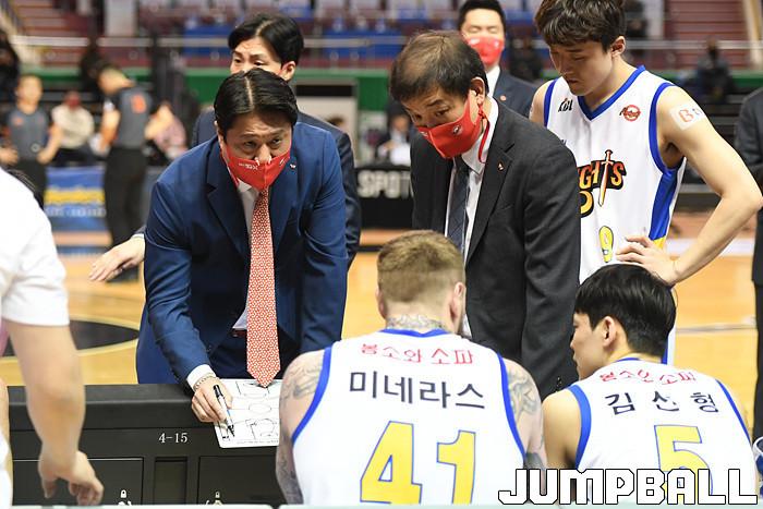 [점프볼=잠실실내/박상혁 기자] 28일 잠실실내체육관에서 열린 2020-2021 현대모비스 프로농구 서울 삼성과 서울 SK의 S-더비 경기, SK 문경은 감독이 작전 지시를 내리고 있다.