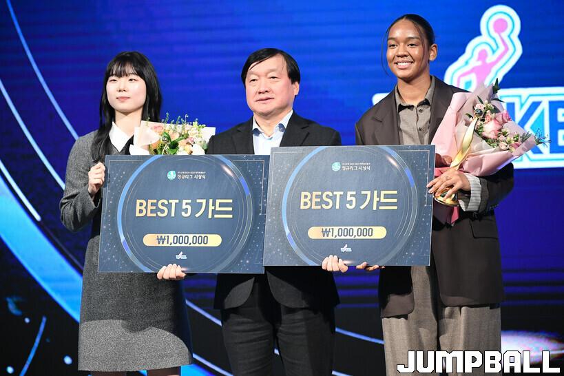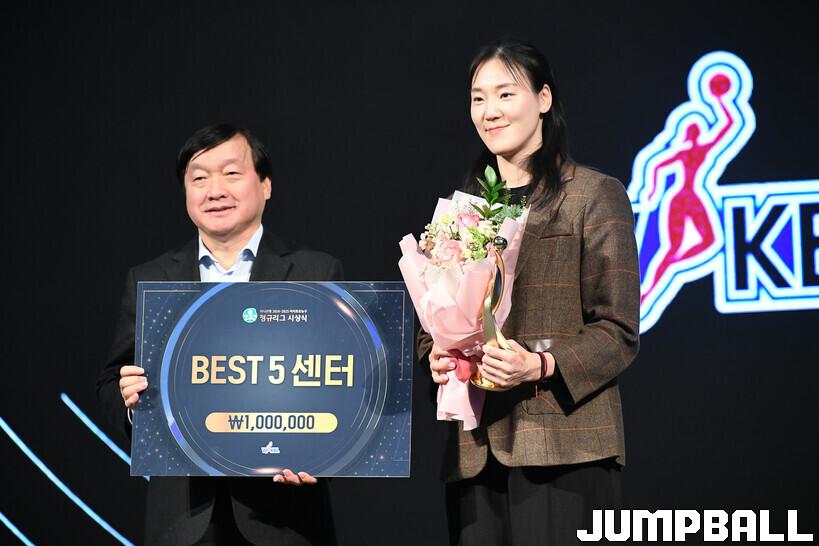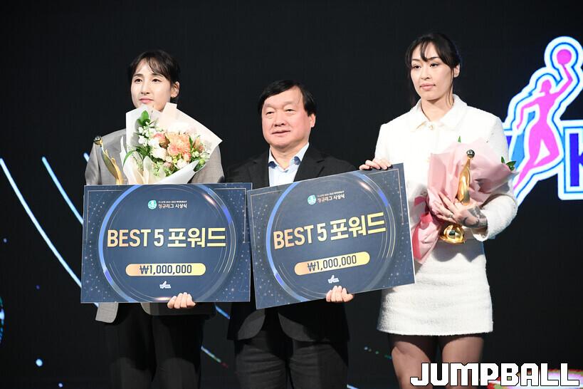 허예은(KB스타즈, 2회) : 많은 분들이 최하위 후보로 예상했고, 나도 두 시즌 전과 같은 두려움을 안고 시즌을 시작했다. 우리 팀에겐 시험대였던 만큼 결과로 증명해야 했다. 좌절한 날이 더 많았지만, 어느 때보다 승리의 소중함을 배웠다. 부족한 나에게 든든한 울타리가 되어준 팀에 감사드린다. 승부를 결정지어야 하는 슛을 실패했을 때도 괜찮으니 잊고 다음 경기를 준비하자며 격려해주셨다. 동료들, 감독님과 코치님들, 사무국 등 멋진 팀의 일원이라는 게 자랑스럽다. 우리 팀 최고참 (염)윤아 언니를 비롯해 (김)정은 언니, (이)경은 언니 등 고참들을 보며 배운 게 많았다. 후배로서 부끄러웠다. 실력은 부족하지만, 마음가짐은 후배들이 따라가야 한다고 생각한다. 선배들이 만든 멋진 길을 우리도 후배들에게 물려줄 수 있도록 노력하겠다. 믿어준 팬들의 편지를 보며 눈물 흘릴 때가 많았다. 그럴 때일수록 자랑스러운 선수가 되어야 한다고 다짐했다. 팬들 덕분에 버틸 수 있었다. 다음 시즌에는 더 발전한 선수로 돌아오겠다.
