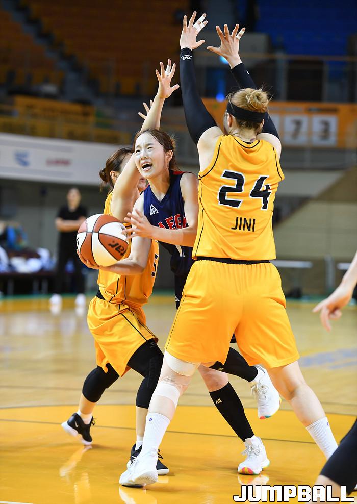 [점프볼=청주/문복주 기자] 16일부터 21일까지 청주체육관에서 '2020 우리은행 박신자컵 서머리그' KB스타즈와 대구시청의 경기, 대구시청 김수진이 힘겹게 돌파를 시도하고 있다.